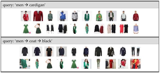 Figure 10 shows the results of the apparel retrieval for category-based queries. These search results indicate that the proposed approach correctly retrieves fashion products according to the queries.