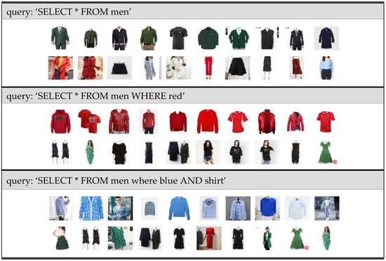 Figure 8. The results with the highest probability mainly include men’s clothes, whereas those with the lowest probability are women’s clothes. For the second query—“SELECT * FROM men WHERE red”—the search focused on red apparel for men. The results with the highest probability were appropriate, and those with the lowest probability included women’s clothing without the red color. For the last query—“SELECT * FROM men where blue AND shirt”—the results with the highest probability were blue men’s shirts, as intended, and the 10 images with the lowest probability included women’s clothes without the blue color.