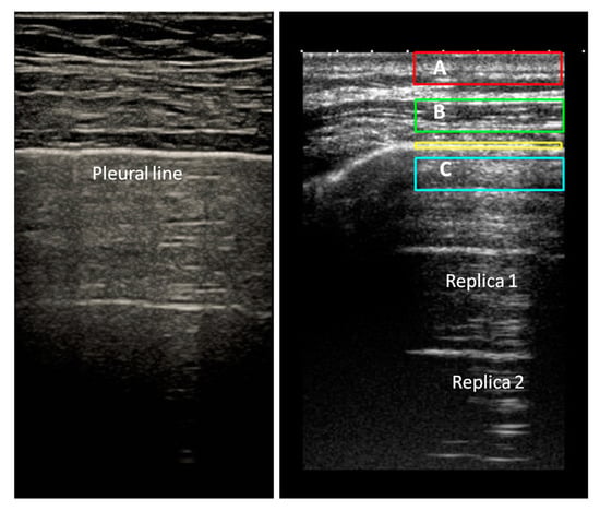Normal pleural line. (Left): Healthy subject, B Mode image. The pleural line is regular, below the pleural line, the image does not represent the anatomy of the lung. (Right): Below the echogenic pleural surface the replica effects of the pleural line can be seen. In the box C, the replica of the contents of box A and the mirror effect of the contents of the box B are added together. (Images obtained with a commercially available machine, Toshiba Aplio XV, equipped with a linear probe, 9 MHz, without harmonic imaging).