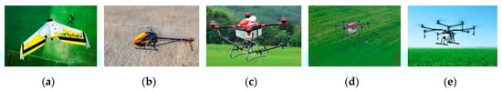Fixed-wing (Figure 1a) RPASs are entirely different in their design compared to multi rotors, and aerodynamic shape of two wings provides an easy glide for RPAs. The single-rotor helicopter (Figure 1b) is a model with just one big-sized rotor on top and one small-sized rotor on the tail of the RPA. Quad copter (Figure 1c), hexa copter (Figure 1d), and octo copters (Figure 1e) are multi-rotors which are lifted and propelled by four, six, and eight rotors, respectively.