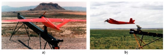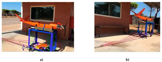 (a) ALO Avión Ligero Observación) RPA in the launching pad (b) ALO taking off.