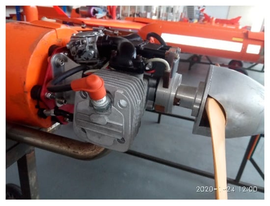- Propulsion system: The power plant consists of a two-cylinder two stroke reciprocating engine providing 6.8 HP (horse power). The engine drives a fixed-pitch two-blade propeller. The propulsion system is located at the front of the RPA and is joined to the bulkhead by means of four silent blocks. The fuel tank is located in the wing. The carburetor has an integrated fuel pump. The fuel used is an oil: gasoline mixture 1:50 [71].