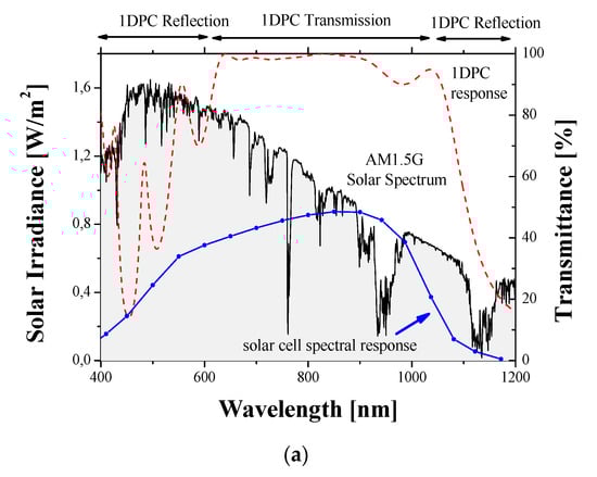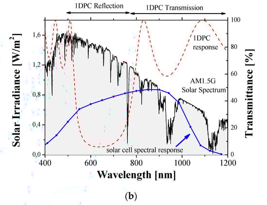 For instance, Figure 1a shows the spectral response of a 1DPC, designed to reflect the near infrared irradiation that generates thermal losses in the solar cell. However, it remains transparent to the visible solar spectrum to allow the photovoltaic effect in the semiconductor. Good matching between 1DPC transmission spectrum (red line) and spectral response of the solar cell (blue dots) might be achieved. However, if the purpose of the 1DPC is to act as back selective reflector, the most convenient conditions vary, as illustrated in Figure 1b: the device reflects photons within the visible range, while the near infrared spectrum is transmitted.
