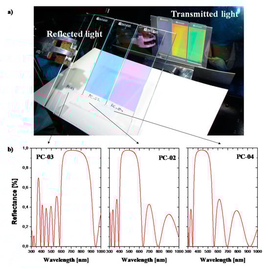 The thickness of the dielectric layers used to manufacture the 1DPC was a critical parameter. Figure 2 shows that differences in the thickness of these layers implied significant differences in the optical performance of the samples: three samples (from left to right, PC-03, PC-02, and PC-04) with the same dielectric material structure but different thicknesses (Table 1) were used to validate the design specifications of the photonic crystal. Figure 2a shows the reflection spectrum, explaining the different colors obtained depending on the thickness used for each dielectric layer. In the backside, the transmission of the same samples using a mirror located at the rear side of the samples is shown. It can be observed that front and back color for each sample was different, due to the different thicknesses employed. Reflectance spectrum for the objective of this research is shown in Figure 3. According to the results summarized in Table 1 and Figure 2, when SiO2 thickness differs 30% from the objective one, the Bragg peak shifts to lower wavelengths with undesired effects on the optical properties: transparency is lost in favor of blue-violet colors.