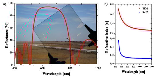 The 1DPC has been designed to reflect in the visible solar spectrum, so its maximum reflectivity is centered at approximately 650 nm and Bragg peak deal with 300 nm width (Figure 3a). Spectroscopy ellipsometry also provided an accurate measurement of refractive index data of the dielectric layers used (SiO2 and TiO2) to manufacture the 1DPC. Cauchy dispersion relation was selected as a theoretical model for the experimental data fitting (Figure 3b). 1DPC was finally achieved considering 13 dielectric layers alternating periodically SiO2 and TiO2.