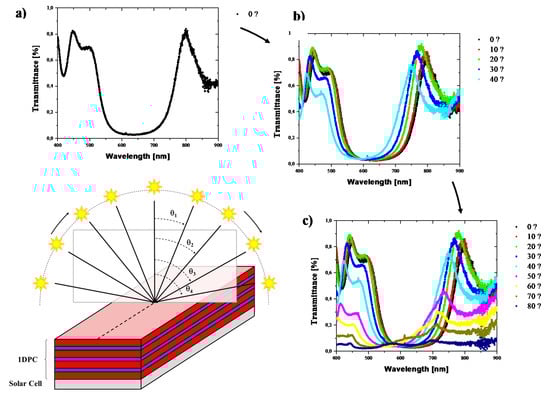 In this section, analyses of the 1DPC incident angle dependence, solar spectrum distribution and polarization of the light are shown, as well as their impact on the optical coupling with the solar cell. The first characterization consisted in determining the influence of the incident angle of the light on the reflectivity exhibited by the 1DPC. For this test, the dielectric periodic structure was characterized using a UV-VIS spectrometer (Figure 4). It was observed that as the incident angle increased, the Bragg peak position shifted to lower wavelengths and its original gaussian profile was shifted from its original position (Figure 4b), and finally, its shape was distorted (Figure 4c). The limit was identified when the incident angle was higher than 60°: under these conditions, Bragg peak reflection shifted about 100 nm and its profile became significantly smooth, so the energy reflected was totally negligible (Figure 4c, yellow line). The largest absorption was obtained with the longest optical paths used by the light across the active layer, together with the reduction of the coupling from higher reflection at the glass–air interface.