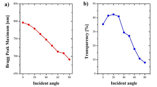 In particular, when the incident angle was higher than 60°, the transmission spectrum did not exhibit a photonic band gap, which was the key parameter that characterized the 1DPC performance. Thus, for these conditions, the solar cell coupled to 1DPC had a lower transparency than the reference sample without any 1DPC. After fitting Bragg peak position as a function of the incident angle (Figure 5a), a linear relationship was observed, in well concordance with Equation (2), well-known as Wulff–Bragg’s condition.
