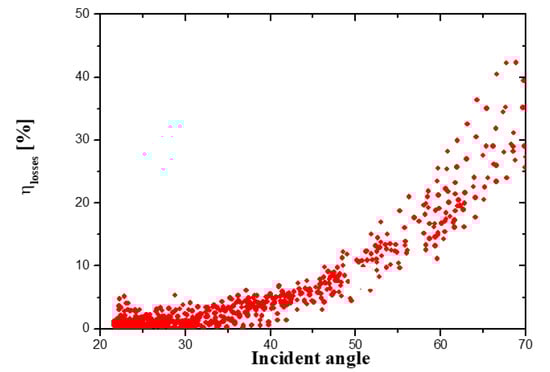 The photocurrent of both devices was measured. The first remarkable evidence was that when the incoming radiation to the devices was normal, both signals were proportional, as expected. However, this correlation was lost during the sunrise and sunset, due to the high incident angles for the incoming radiation irradiance. Optical coupling losses , due to the 1DPC performance, were beyond those expected under the design conditions, as defined in Equation (4) and plotted in Figure 6.