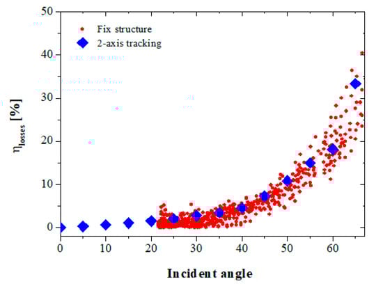 Losses derived from the 1DPC and solar cell optical coupling measured into a 2-axis tracking system, to avoid the effect of irradiance spectrum modification during the day. Red circles represent data collected at the fixed structure (Section 3.1), while blue diamonds correspond to data collected from the 2-axis tracking experiment (Section 3.2).