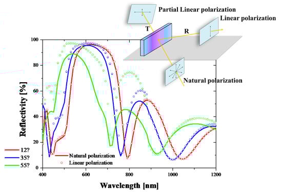At low incident angles, there was a coincidence between linear and natural reflected light. This means that with the normal incident direction or low incident angles, reflectivity was independent of the polarization. However, when the incident angle increased, there was a difference in intensity between light with linear polarization reflected and natural light, but the Bragg peak position remained almost constant. At higher incidence angles, due to the periodic structure of the photonic crystal, it was possible to create spectral selective mirrors that were polarization dependent. Polarization affected the photovoltaic device in terms of the intensity of the light reflected or transmitted, but there was no dependence on the Bragg peak shift observed previously. These results were in good concordance with Equations (3)–(5). Angular reflection modified polarized light scattering in plasmonic structures, and this opens an interesting portfolio of applications like splitters.