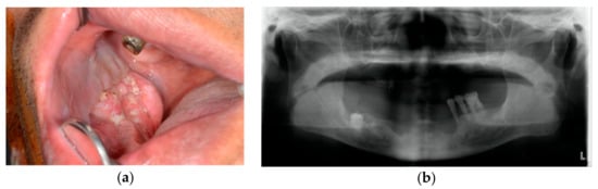 Initial examinations: (a) Intraoral photograph showing the granulomatous lesion on the right lower gingiva; (b) Panoramic view showing the impacted tooth and osteolytid lesion.