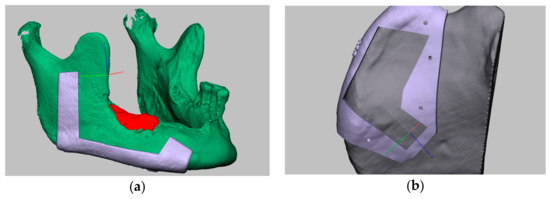 Computer-based planning and design of surgical guides: (a) Planning and computer-assisted design of the surgical guide for the mandibulectomy; (b) Planning and computer-assisted design of the surgical guide for the iliac crest bone flap.