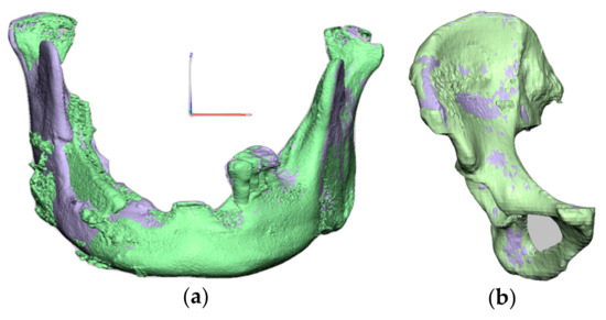 Fused 3D models for comparison. (a) Purple is the preoperative 3D model, green is the postoperative 3D model of the mandible; (b) Purple is the preoperative 3D model, green is the postoperative 3D model of the iliac bone.