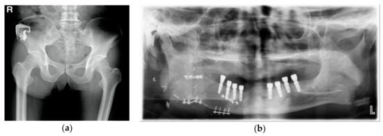 With the development of micro-anastomosis techniques and the development of microsurgical instruments [6], reconstruction using free flaps on oral and maxillofacial defects is the best prognostic option. In particular, reconstruction of the mandibular region, in which soft and hard tissues are simultaneously depleted, has been performed using osteocutaneous free flaps or using reconstruction plates and soft-tissue free flaps. Reconstruction using a reconstruction plate and soft-tissue free flap has the disadvantage of causing fracture and exposure of the plate in the long term [7,8]. In the case of an osseous free flap, bone union with existing bone tissue can be achieved within 2–3 months and is maintained in the long term through normal bone remodeling [9]. Therefore, a vascularized free flap that comprises hard and soft tissues is mainly used, and reconstruction using a reconstruction plate is becoming a secondary option.