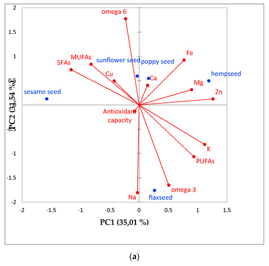 As presented in Figure 5, similitudes were found between sesame seeds and sunflower seeds due to the contents of MUFAS, SFAs, Cu and antioxidant capacity. Similarities were also found between poppy and hempseeds, mainly due to the content of Ca, Mg, Fe and Zn, while flaxseed is different due to its content of omega-3, PUFAs and K.