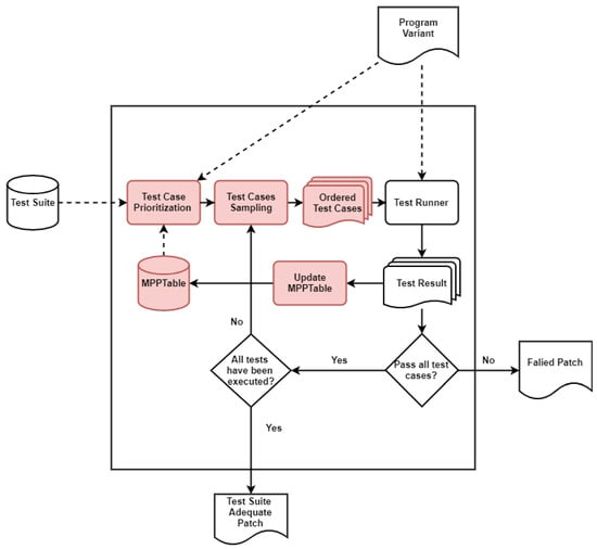 Figure 2 clearly explains the overview of our proposed method MPTPS (Modification Point-aware Test Prioritization and Sampling). Initially, Test Runner takes Program Variant and Ordered Test Cases from Test Suite as inputs for validation and produces a result. Ordered Test Cases are nothing but prioritized and then sampled test cases (in the same prioritized order). From the Test Results, we extract the failing test cases information and Update MPPTable by adding (increasing) value ‘1’ to every failing test case in the patch killing count column of the table. After MPPTable is updated with the test execution results, Test Case Prioritization takes place by prioritizing the patch killing count in descending order from the table. Prioritized test cases then undergo the Test Cases Sampling phase to split the test suite into multiple subsets. These Ordered Test Cases subsets are executed one by one until the last subset, if there are no failing tests during execution. If all the subsets (test cases) pass, it is delivered as a Test Suite Adequate Patch to the developer. Otherwise, the Test Runner will be stopped after completely executing the subset with a failing test case(s). In this case, the outcome is considered a Failed Patch. Subsequently, the fitness score is calculated for the patch and based on the score, and the Failed Patch might undergo modification once again.
