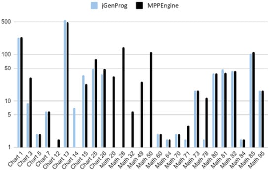 We investigated the effectiveness of MPPEngine against jGenProg in terms of reducing test execution time and cost. We ran experiments on the Defects4j [] dataset used in Astor [,,] to compare the results more effectively. So, we filtered out 48 bugs from 4 Defects4j (Chart, Math, Lang, and Time) subjects for which jGenProg said to have generated at least one test suite adequate patch. As per the experiments conducted among other tools in Astor [,,], jGenProg generated patches faster using test suites. There were 19 patches out of 48 patches generated within 3 h. So, we decided to check that condition with our approach. Randomness in the results was reduced by running all the experiments 3 times.