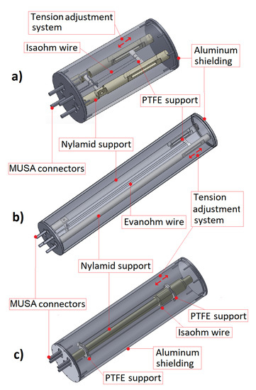 Descriptions of the geometry and the model of the CRs have been described in previous works [1,2,3,25,26]. However, none of those describes details of the construction process. The geometry of the wire supports, the wire strain, and the terminal–wire joining method strongly affect the stability of a CR resistance value. The wire heat treatment of the CR is fundamental to reduce their TC below 1 /C. Even if the CR is in a temperature-controlled environment within ±0.01 C, to get variations of less than 0.01 in their reference value, its TC needs to be under 1 /C.