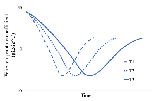 The next step to be considered in the development of CRs is the heat treatment of the wire to decrease their TC. In this research, Evanohm-S [31] and Isaohm [32] wire spools with previous heat treatment by the manufacturer were tested; the properties of these kinds of alloys make it possible to realize a heat treatment to modify their TC. As was reported by Starr [5], regardless of the heat-treating temperature used in the wire, its TC decreases from the positive value of 50 /C, passes through zero, and eventually reaches a minimum value of around −35 m of diameter and a resistivity of 154.8 /C; if heat treatment continues, the TC starts becoming less negative, passing through zero again, and continue increasing slowly. At higher temperatures, less time is needed to achieve a change in the TC; however, these parameters depend on the NiCr alloy wire and on their gauge. This behavior is represented by Figure 3. Hence, to decrease the TC of NiCr alloy wires, there are two independent variables, temperature and time of the heat treatment. An explanation of the relationships between the heat treatment time and the temperature is described by Starr in [5].