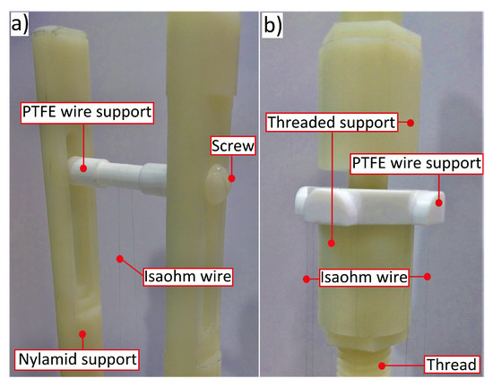CR’s wire supports with strain adjustment system, for: (a) the bifilar CR, and (b) the octofilars CRs.