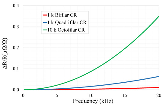 Figure 5 display the calculated frequency performance of the bifilar, quadrifilar, and octofilar CRs using the dimensions from Table 1 in Equations (1)–(3), respectively, and taking into account the change in resistance due to the eddy current effects of Equations (4) and (5). The change in the resistance concerning its nominal value increases with the number of wire segments. However, the change in resistance at frequencies under 5 kHz is less than 0.03 for any of the three types of CRs. Hence, at 1592 Hz, the resistance value could be considered equal to the DC calibrated value within 0.01 .