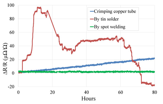 The results for the three methods for joining Evanohm-S to a terminal are shown in Figure 6. It is evident that the tin soldering method does not achieve a proper joining, causing changes in the measured resistance values up to 90 in less than one day. The method of introducing the wire in a copper tube and crimping it manifested a 0.25 /hour drift. The drift could be due to the mechanical stress of the tight section of the wire that changes the shape of the wire in the junction. For this reason, the methods that involve mechanical stress in the wire should be avoided. Finally, joining with a spot welder does not present drift or changes in the measured resistance value. The standard deviation of the measurements with the last method is less than 0.5 and is due to the measurement system in the 100 range.
