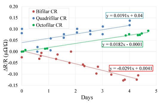 As observed in Figure 8, the stability of the three types of CR with a wire strain that accomplishes the geometry of the CRs, are less than 0.03 /day. The measurements were made using a MIL 6000B bridge, with an applied power of 10 mW and within a temperature-controlled environment of ±0.02 C. The measurement system gives the 1:1 or 10:1 ratio between the measured CR and a 10 k ESI standard resistor. Because the reference standard resistor has stability better than 0.1 /year, the stability of the measured CR was not affected.