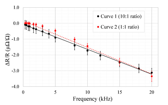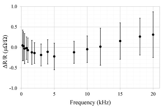 As seen in Figure 5, with the dimensions of Table 1, the change in the resistance value of the CRs at frequencies under 2 kHz could be considered as equal to the DC value with an uncertainty of less than 0.01 . Nevertheless, it is better to use the relative difference between the measured and calculated frequency dependence between different CRs as the uncertainty due to the change in the resistance value.