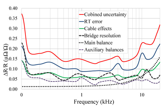 The frequency dependence evaluation of the CRs was done by calculating the relative difference between the measured and the calculated equivalent parallel resistance ratio of the CRs. Figure 9 shows the results for the 10:1 ratio between the RC-10k-D5e and the HADDAD1000-1201, from 300 Hz to 20 kHz. The ratio measurement results are in agreement with the computed ratio within the expanded uncertainty (k = 2.0). As seen in Figure 10, for the entire measured frequency range, the principal uncertainty components for the 10:1 ratio measurements are related to the RT error, the cable effects, the main balance resolution and the auxiliary balances of the bridge; for frequencies higher than 5 kHz, the main balance injection has a significant uncertainty contribution. The complete description of the uncertainty sources can be found in [33].
