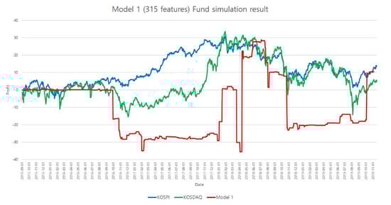 - The 315 input features used in Model 1 were developed as follows. After analyzing the data distribution of the 715 novel input features presented in a previous study [], we have proposed 315 meaningful input features by eliminating all noise-prone values that affect prediction performance. This model ultimately yields profits over KOSDAQ.