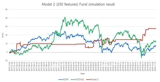 Among our models, Model 2 had the best predictive performance and highest profit. This is a model that uses a combination of binary features and price features. Moreover, Model 2 had a higher return than the KOSPI/KOSDAQ and showed a profit greater than 27% for approximately 4 years. A graph of the profit of Model 2 is shown in Figure 5. Model 2 sometimes showed flat graphs when the periods have no or few recommended stocks. Nevertheless, there is clearly a relatively stable profit, and the graph continues to rise overall.