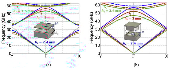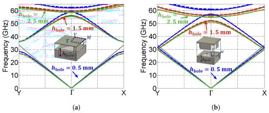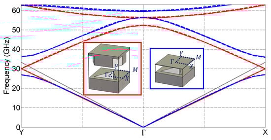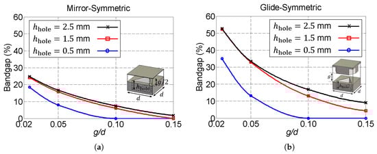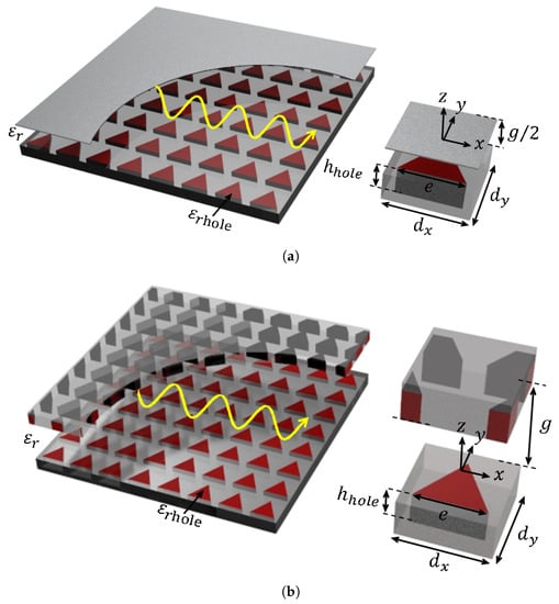 - Padilla, P.; Palomares-Caballero, A.; Alex-Amor, A.; Valenzuela-Valdés, J.; Fernández-González, J.M.; Quevedo-Teruel, O. Broken glide-symmetric holey structures for bandgap selection in gap-waveguide technology. IEEE Microw. Wirel. Compon. Lett. 2019, 29, 327–329. [Google Scholar] [CrossRef]