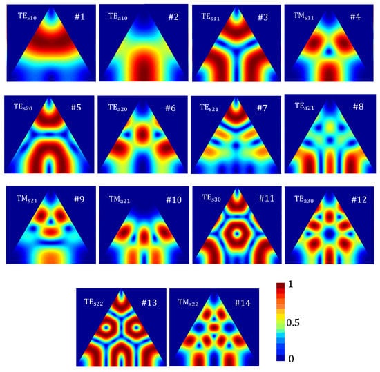 - Wang, C.Y. Exact solution of equilateral triangular waveguide. Electron. Lett. 2010, 46, 925–927. [Google Scholar] [CrossRef]