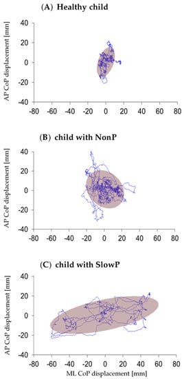 The analysis of quiet stance (static posturography) highlighted alterations of postural control in subjects with cerebellar deficits. In fact, children of both the SlowP and NonP groups showed an ellipse area greater than H (Kruskal–Wallis p = 0.039), mainly due to a greater CoP displacement in the mediolateral direction (Kruskal–Wallis p = 0.022).
