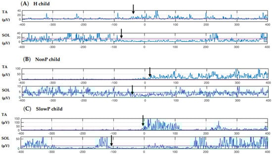 EMG (electromyographic) of shank muscles of the stance leg. Comparison among healthy children H, panel (A), children with non-progressive PCA NonP, (B) and children with slow progressive PCA SlowP, (C). One representative subject for each group. Time 0: APA (anticipatory postural adjustment) onset, defined as the first backward shift of the CoP (center of pressure). Black arrows show SOL (soleus) inhibition and the following TA (tibialis anterior) excitation. Note that the time delay between these two reciprocal actions gradually increased in children with NonP and SlowP with respect to H children.