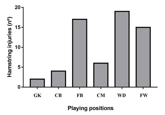 Hamstring injuries distribution, attending to the playing positions. GK: goalkeepers, CB: central back, FB: fullbacks, CM: central midfielders, WD: wide midfielders and FW: forwards.