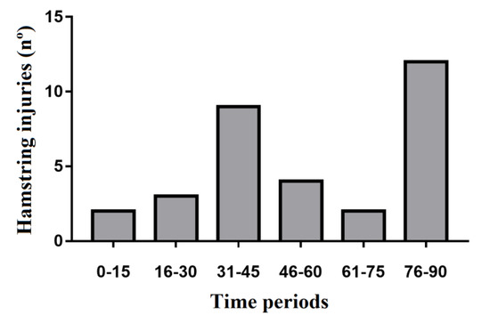 Similar to previous studies [9,25], hamstring injuries occurred more frequently toward the end of each half of match play (i.e., 30–45 min and 75–90 min), and this might be due to fatigue-related effects. In this sense, Greig et al. [48] observed that professional soccer players experienced a reduction in the eccentric strength of the hamstrings as a soccer match progresses, increasing the injury risk in this muscle complex [49]. In addition, Schuermans et al. [41] postulated that, under fatigue conditions, the biceps femoris have to partly compensate for the lack of endurance capacity of the semitendinosus, increasing the hamstring injury risk. This finding supports the importance of building fatigue tolerance in young soccer players through targeted training and build-up of high chronic training loads, as well as to periodize preventive programs in fatigue situations, mainly based on strength training [50].