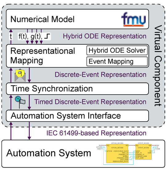 - Automation system interface: The actual integration of the virtual component into the automation system is implemented in the automation system interface, e.g., via a network connection. It is assumed that the automation system interface simply relays discrete events e without changing their abstract semantics.