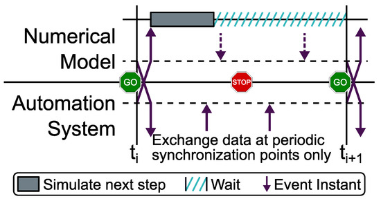 One major drawback of periodic event mapping is that instant changes in both the FMI model and the automation system cannot be directly communicated, but have to be delayed until the next communication point . Hence, the event mapping may be well-suited for periodic control and communication schemes, but hinders asynchronous integration of virtual components. In particular, for delay-sensitive applications, a considerable deviation may be introduced, and needs to be carefully chosen. The predictive approach proposed in [7,8] and illustrated in Figure 3 can be used to dynamically choose the next synchronization point and to reduce nominal delays. For predictive event mapping, FMI events and IEC 61499 events are directly mapped without introducing periodic synchronization events . Nevertheless, an FMU or the interface program may choose to trigger intermediate events to communicate altered continuous outputs.
