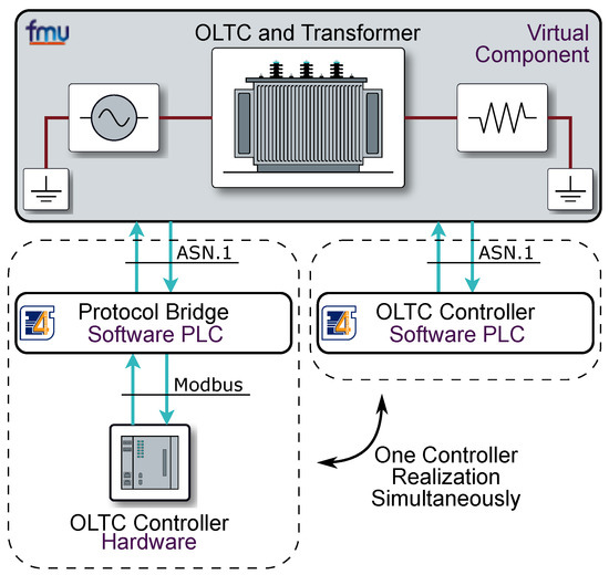 Based on the reference model, three experimental setups were designed, illustrated in Figure 4. In each experiment, a virtual component, which comprised the OLTC, the transformer, the load, and the voltage source, was instantiated. The FMU defining the virtual component was directly exported from the reference model using the FMI 2.0 for Model Exchange standard via the FMI Kit for Simulink in Version 2.4.0. Two controller implementations with identical functionality were manually derived from the reference model and alternatively used in the experiments.
