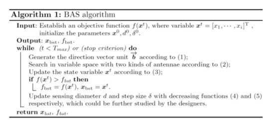 The hyper-parameters of these six algorithms were tuned by BAS and the definitions of the hyper-parameters are summarized in Table 1. BAS can be used for global optimization questions [34]. It simulates the behavior of beetle. The pseudo code is shown in Figure 1.