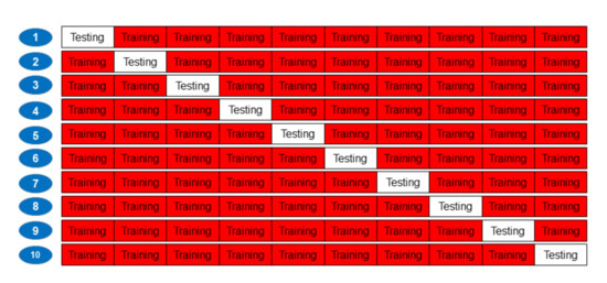 To validate the regression model, some methods have been used, such as the simple substitution method [35], bootstrap method [36], holdout method [37], and bolstered method [38]. The k-fold cross-validation (CV) was employed for the training data in this paper [39], in which k was assigned to be 10 according to the recommendations and number of datasets. During hyper-parameter tuning, the training data were divided into 10 folds. Nine folds were used for training, while other one was used for validating (see Figure 2). The final result of a model was the average of the 10 results from the 10 rounds. By this method, the overfitting problem can be overcome.