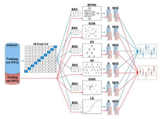 BPNN is a type of artificial neural networks (ANN). The main advantage is that the weight by the error between the real values and calculated output can be adjusted and iterated using back propagation [28]. SVM uses the hyperplane to classify samples into various classes [29]. DT can partition the labeled dataset recursively into increasing small subdivisions according to a set stop criterion until a suitable breakdown level is reached [30]. RF uses an ensemble of classification trees to achieve classification and regression [31]. K-NN is a non-parametric and instance-based learning model for classification and regression [32]. LR is an extensively applied approach to classify dependent variables. LR aims to find the best hypothesis to establish the relationship between outcome and variables [33].