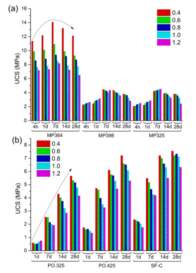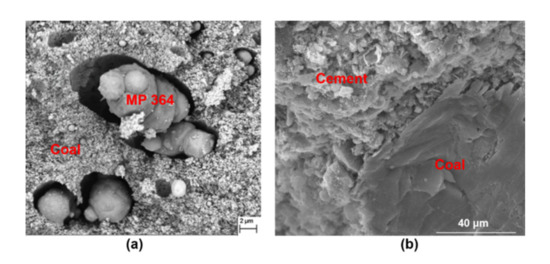 Figure 4 shows the UCS results of coal-grout composites. It can be seen that the 7-day UCS of the coal-MP 364 composite is higher than other chemical grout composites with the same coal-grout ratio. As for the cementitious grout composites with the same coal-grout ratio and curing time, the UCS of SF-C composites was the highest followed by coal-P.O 42.5, while coal-P.O 32.5 had the lowest UCS. It can also be observed that the UCS of coal-grout composites decreased with an increasing coal-grout ratio. The possible reason for this is that the coal particles were bonded together by the grout; as the grout decreased, the bonding became weaker [49]. Furthermore, the curing time had different effects on cement-grout and chemical-grout composites. The UCS of coal-chemical grout composites increased and peaked on the seventh day, and then declined. This is due to the rapid chemical reaction of the chemical grout during the early days. However, an obvious shrinkage of the chemical grout was observed after the seventh day, especially in the MP 364 group (shown in Figure 5a). The porous structure affected the overall strength of the chemical grout composites. As for the coal-cement grout composites, the UCS increased with curing time, but the growth rate decreased, which agreed well with much of the literature [50,51,52]. In addition, its average early strength (1-day strength) was lower than the 4 h strength of coal-chemical grout composite. In terms of its microstructure, no clear shrinkage between coal and cement was observed, indicating that cementitious grout performs better than chemical grout (Figure 5b).