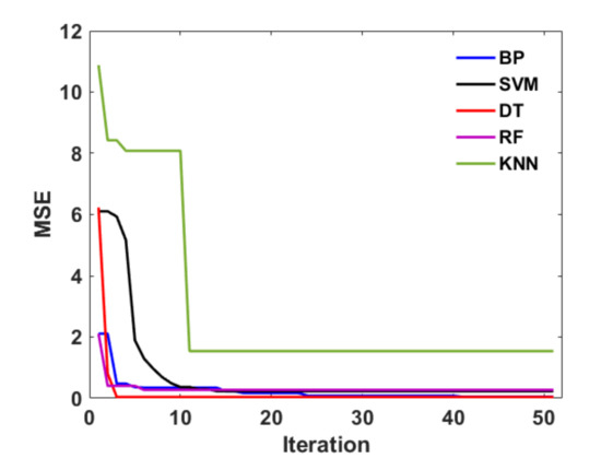 The effectiveness of using BAS to tune hyper-parameters was analyzed by tracing the MSE values of each iteration. Figure 6 shows the average MSE curves versus iteration during the hyper-parameter tuning. Different evolution patterns can be seen for different ML algorithms in terms of the MSE values and convergent rates. It took more time for KNN and SVM to converge than the other three algorithms, and KNN behaved the worst with the largest MSE value after convergence. Also, the MSE of DT decreased sharply with each iteration during BAS tuning to the minimum value among these ML algorithms. This indicates that BAS tuned DT most efficiently. Overall, the ideal hyper parameters of these models could be found by BAS efficiently and reliably. These results of hyper-parameters are shown in Table 4.