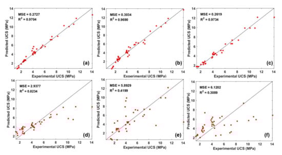 In underground coal mines, the coal-grout composites created by the JG technique were used as a new support material. Due to its cutting and erosion effect, the mechanical properties of the raw coal were completely changed by the injected grout [5,6]. After the JG process, a rigid coal-grout pile surrounded by coal mass was formed with low deformability and high strength, which can provide a sufficient support for roadways in coal mines [7,8,9,10]. In practice, conducting UCS tests is an extensively used approach to assess the supporting ability of support materials [11,12,13]. However, UCS tests are time-consuming and costly since many influencing variables should be considered. To address this problem, an indirect method for evaluating the UCS of supporting materials is to establish empirical equations based on statistical regression [14,15]. Nevertheless, some empirical rules used for designing JG parameters are often conservative and have limited applicability [12]. In addition, the nonlinear relationship between the UCS and the multiple influencing variables is unknown, which makes it more difficult to develop empirical equations [16,17]. Therefore, to predict the UCS of coal-grout composites efficiently and accurately, some computational models are necessary.