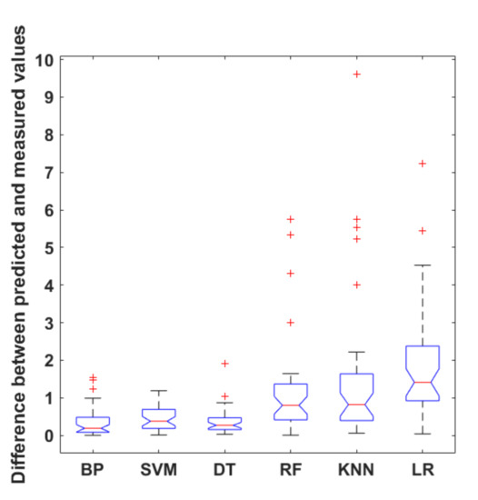 The differences between the predicted and actual values in the testing dataset can be compared using the boxplot (see Figure 8). A boxplot is convenient to visually display the distribution of the data through their quartiles [53]. It can be seen that DT was grouped the most tightly (with a comparatively short boxplot), and was slightly better than BPNN and SVM, although no outliers were observed in SVM. This indicates the overall UCS values of the composites were predicted accurately by these three algorithms. As for RF, KNN, and LR, these boxplots are comparatively tall with larger interquartile ranges and more outliers, indicating that the predicted UCS values were more scattered. LR was the worst-performing algorithm in terms of the highest median and largest interquartile range.