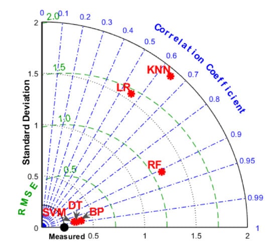 The realistic characteristics of these ML algorithms can be graphically indicated by a Taylor diagram [54]. The Taylor diagram shown in Figure 9 provides a summary of the skill with which the six ML algorithms simulate the relationship between the predicted and observed UCS. The distance between each ML algorithm and the point labeled “measured” is a measure of how realistically each algorithm reproduces the measured values. It is clear that DT, SVM, and BPNN lie nearest the point marked “measured” with comparatively higher R2 and lower RMSE, demonstrating that the three algorithms agree well with the actual values. LR has a low pattern correlation, while KNN has larger variations than the actual values. It should be noted that although RF has about the same correlation coefficient as SVM, DT and BP, the standard deviation of RF is much larger, resulting in a larger RMSE.