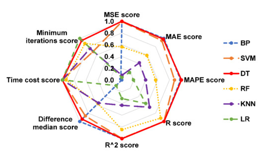 To compare these ML algorithms more comprehensively, some other statistics including mean absolute error (MAE), mean absolute percentage error (MAPE), minimum iteration, and time cost were also introduced in this study. To visualize data with so many variables, a radar chart is a good choice. The radar chart is composed of a series of equi-angular spokes arranged radially from the center, with each spoke standing for one statistical measure. The spoke length is proportional to the normalized magnitude of the measure between 0 (worst) to 1.0 (best) [55], and hence, a better model encloses a worse model. It is easily seen from Figure 10 that DT, SVM, and BPNN performed the best overall, and enclosed RF, KNN, and LR, although SVM performed slightly worse in terms of iteration times, indicating that SVM cost more time and effort during modeling. Among the models with poorer performance, LR was nearly enclosed by KNN due to lower scores for several variables including MSE, MAE, R, R2, and difference median. RF performed better in all the statistics except minimum integration, but many scores were not high enough to represent a good prediction model such as MSE, MAE, MAPE, and difference median.