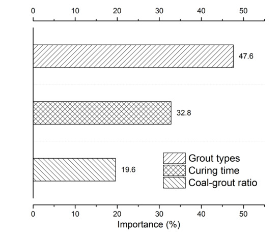Using global sensitivity study by the evolutionary SVM model, the variable importance is calculated, as shown in Figure 11. It can be observed that grout types have the most significant influence on the strength of coal-grout composite with an influencing percentage of 47.6%, followed by curing time (32.8%), while and coal-grout ratio is the least sensitive variable with an influence percentage of 19.6%. It should be noted that the importance score is obtained by the dataset used in this paper. More accurate results can be obtained if more data samples are included in the dataset in the future.